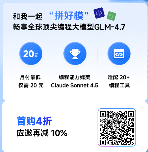 🚀 速来拼好模,智谱 GLM Coding 超值订阅,邀你一起薅羊毛!Claude Code、Cline 等 20+ 大编程工具无缝支持,“码力”全开,越拼越爽!立即开拼,享限时惊喜价! 链接:https://www.bigmodel.cn/glm-coding?ic=RTWWS8HOD6